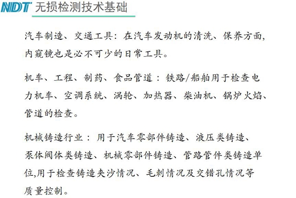 無損檢測技術基礎-工業內窺鏡檢測目錄:1、基礎知識;2、檢測原理;3、關鍵技術;4、應用舉例;5、研究進展和熱點內鏡,亦稱內窺鏡,是一種多學科通用的工具,內窺檢測是一種利用工業內窺鏡對容器、管道、不可拆卸設備的內部、狹小縫隙的內表面、水油等液面以下部位進行質量控制的目視檢測方法