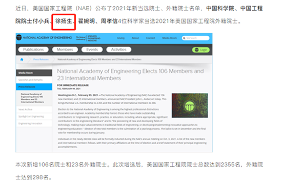 據(jù)悉:當?shù)貢r間2月9日,美國國家工程院發(fā)布通知,(NAE)公布2021年新當選院士、外籍院士名單,本次 新增106名院士和 23名外籍院士。此次增選后,美國國家工程院院士總數(shù)達到 2355名,外籍院士達到 298名。其中,中國科學院、中國工程院院士徐揚生入選!