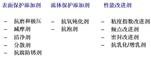 添加劑:清凈分數劑、抗氧抗腐劑、油性劑和極壓抗磨劑