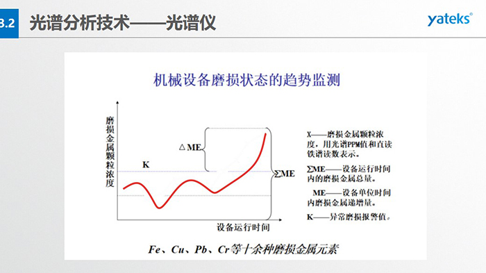 光譜儀的優(yōu)劣勢(shì):優(yōu)勢(shì):1)速度較快40秒;2)精度高PPM微量級(jí);3)取樣少,可同時(shí)進(jìn)行多元素   測(cè)定,適用范圍廣; 4)自動(dòng)化程度高,有多種連鎖保護(hù)。弱勢(shì):1)檢測(cè)的磨粒尺寸比較小,2微米效率最高,最大尺寸不超過(guò)10微米; 2)不能提供磨粒的形態(tài)、尺寸、顏色等直觀形象的信息,因此光靠光譜分析的結(jié)果直接對(duì)摩擦副的狀態(tài)作出判斷有很大的困難; 3) 價(jià)格較貴。