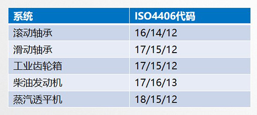 油液污染度常用國際ISO4406-1999污染度等級標準表示,它是以1ml潤滑油中顆粒數來表示,采用三個數碼代表污染度等級,前一數碼代表1ml油樣中尺寸大于4 μm的顆粒數等級,中間的數碼代表1ml油樣中尺寸大于6 μm的顆粒數等級,最后的數碼代表1ml油樣中尺寸大于14 μm的顆粒數等級。