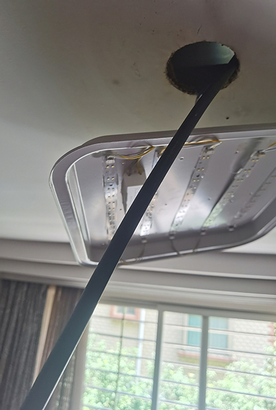 根據(jù)客戶描述和對其需求進行分析,亞泰工程師選配了兩款內(nèi)窺鏡產(chǎn)品趕到客戶現(xiàn)場實地勘查,工程師現(xiàn)場觀察衣柜旁吊頂表面發(fā)霉嚴重,在征得客戶同意后,工程師先使用電動工具將吊頂打了一個10mm的圓孔,然后將亞泰5mm遠焦光纖內(nèi)窺鏡管線穿入輔助工具定型管伸入吊頂內(nèi)部以快速尋找問題點,檢測過程工程師根據(jù)定位使用中焦鏡頭近距離觀察屋頂內(nèi)部情況??蛻舾鶕?jù)內(nèi)窺鏡觀察的內(nèi)部情況,逐步查出屋頂裂縫大小及位置、漏水點位和吊頂木板結(jié)構(gòu)的腐蝕情況,并做好距離位置標記,短短幾分鐘通過內(nèi)窺鏡檢測非常準確、方便的定位到了問題點,整個過程操作簡單、快速、通過亞泰內(nèi)窺鏡本次檢測,為該客戶后續(xù)房屋維修提供了重要參考數(shù)據(jù),為客戶后續(xù)資金的合理利用提供了保障。