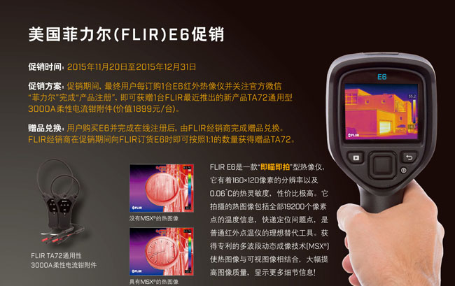 促銷期間,最終用戶每訂購1臺(tái)E6紅外熱像儀并關(guān)注官方微信“菲力爾”完成“產(chǎn)品注冊”,即可獲贈(zèng)1臺(tái)FLIR最近推出的新產(chǎn)品TA72通用型3000A柔性電流鉗附件(價(jià)值1899元/臺(tái))。
